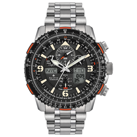 Redefining atomic timekeeping with a turbine inspired bold and powerful timepiece. The newest edition of the CITIZEN Promaster Skyhawk A-T collection is remarkably dynamic and visually appealing. With atomic timekeeping in 43 cities, this watch features a perpetual calendar, dual time, alarms and pilot's rotating slide rule bezel. This model appears with a Super Titanium™ case and bracelet, black dial,...