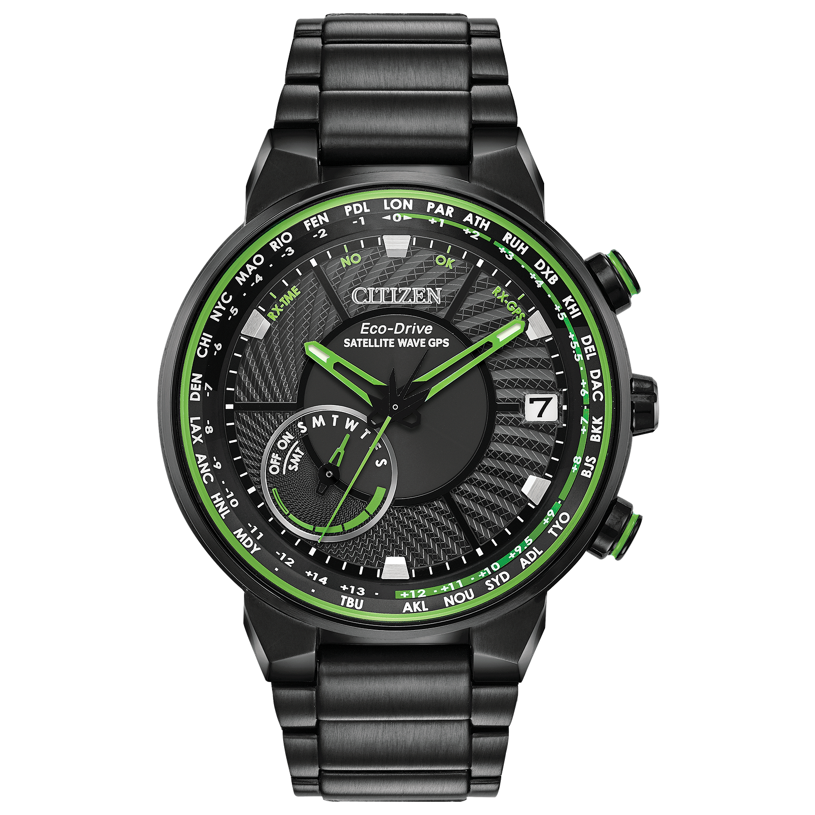 Bolder and brighter. Enhanced technical and architectural design; the new Citizen Satellite Wave GPS Freedom is the leader of the pack with the world's fastest timekeeping signal reception speed from GPS navigation. A sleek black ion-plated stainless steel case and bracelet, black dial and brilliant green accents featured satellite GPS timekeeping technology with worldwide reception and time adjustment in 40...