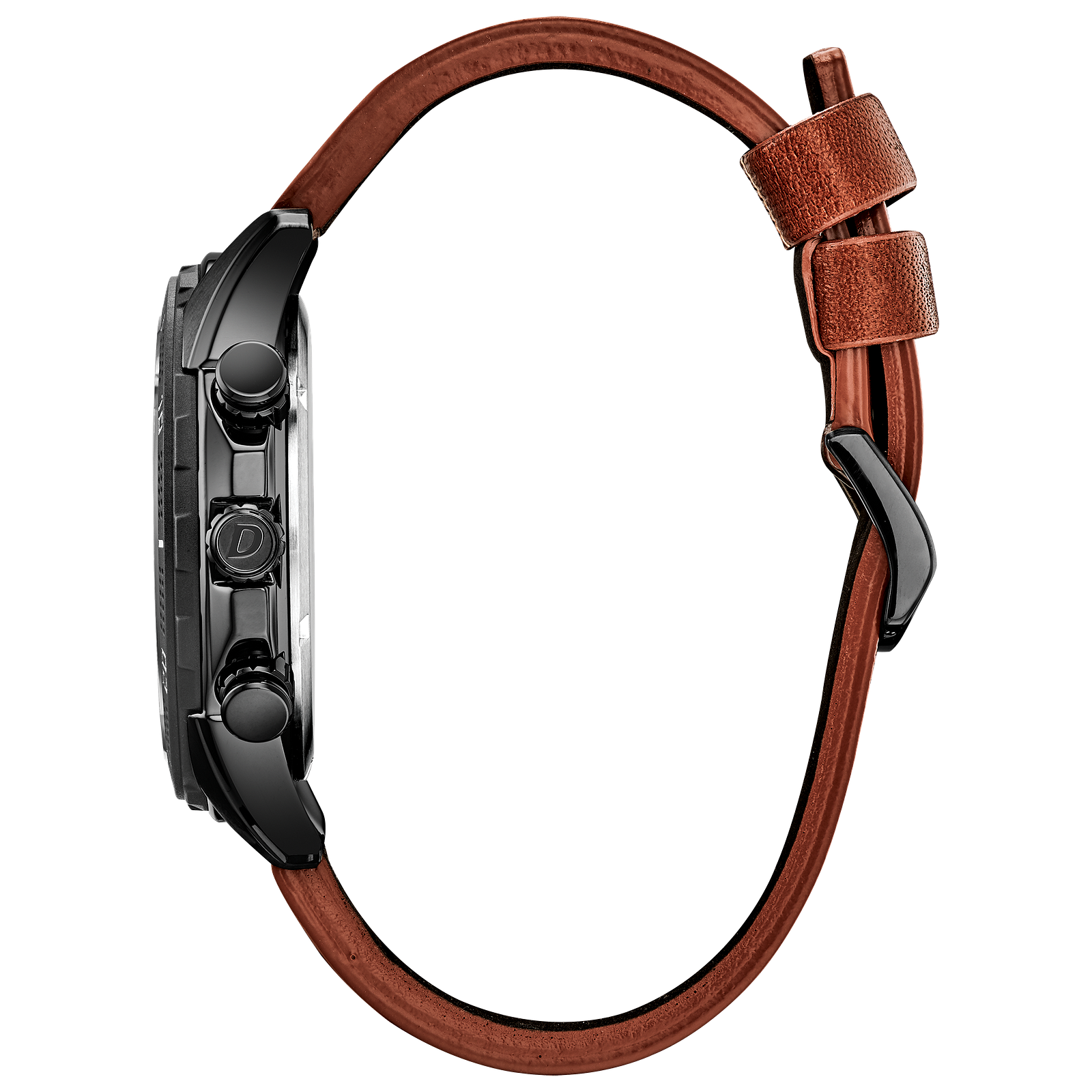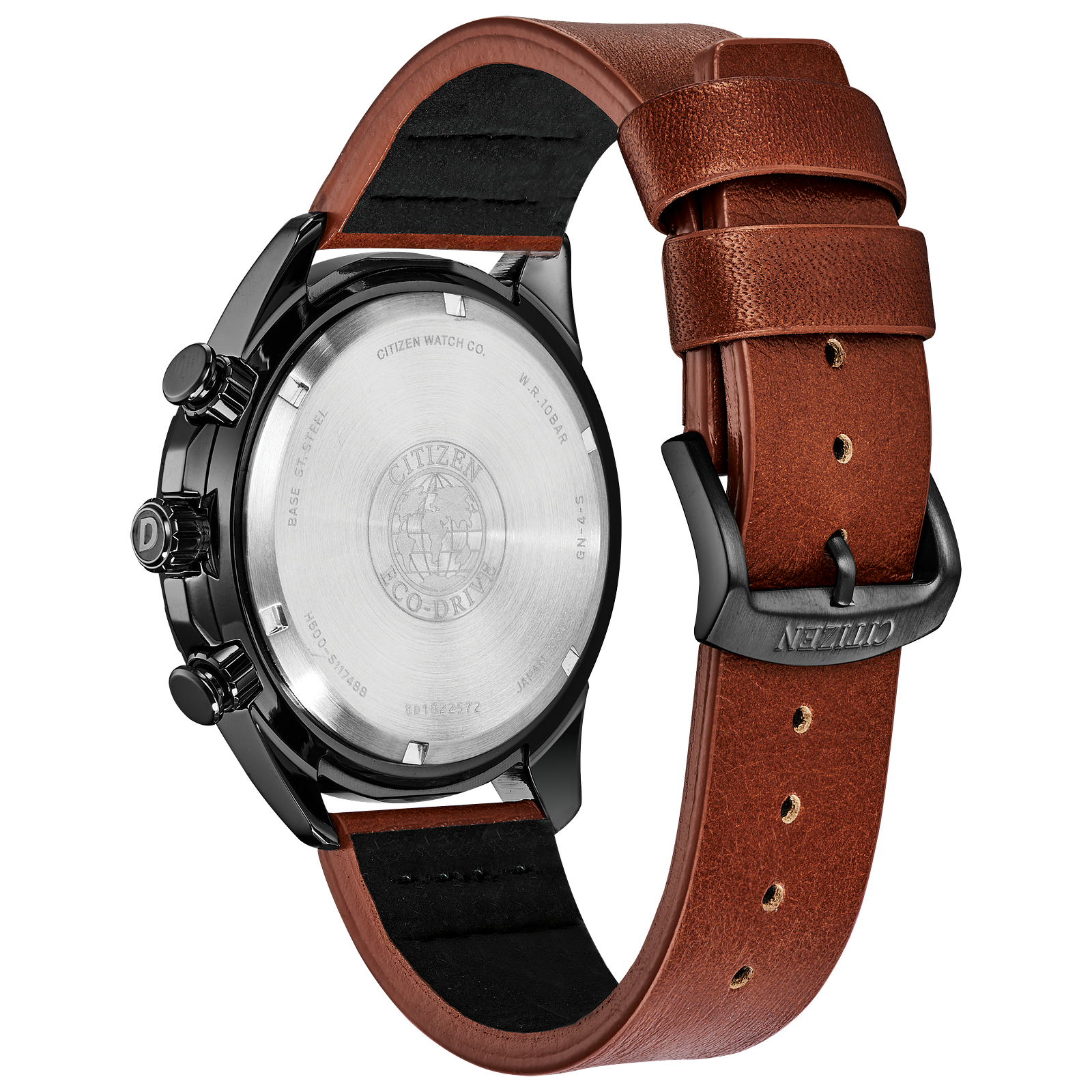 The new Drive from Citizen AR, a laid back feel with classic structure, instantly adding style to any wardrobe. In dark gray ion-plated stainless steel case with gray chroma finishing, light brown strap and black dial with chronograph and 12/24-hour time. Featuring our Eco-Drive technology – powered by light, any light. Never needs a battery. Caliber number H500.