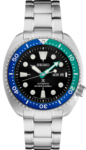 Prospex Special Edition Diver's Watch. Designed for those who treat life as the ultimate adventure, Seiko Prospex keeps moving forward, meeting every challenge with technological excellence and winning design. Inspired by the colors of a tropical lagoon, this vibrant Special Edition features marine blue and green accents on its uni-directional rotating elapsed timing bezel, echoed by the green minute hand...