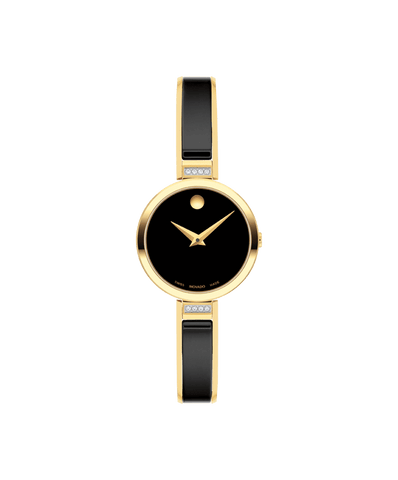 The Moda is defined by a slim, jewelry-inspired bracelet and our iconic Museum Dial. This 24mm watch features a black dial, yellow gold tone dauphine hands, and a ceramic-inlay bangle bracelet with diamond pavé lugs.