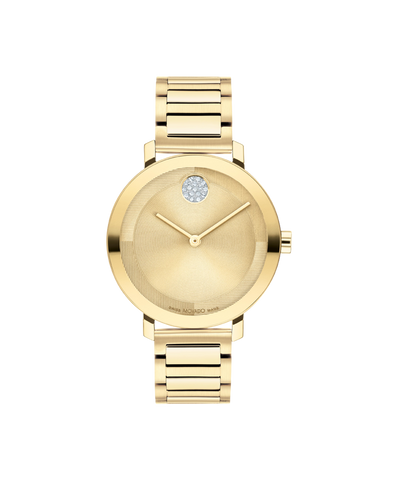 The evolution of modern design with a sharp look and elevated feel. Crafted from pale yellow goldtone ion-plated stainless steel, this sleek timepiece features a statement-making 34mm case that houses a captivating micro-textured goldtone dial with a glossy lacquer overlay, slim hands, and our iconic dot motif at 12 o’clock in sparkling crystals.