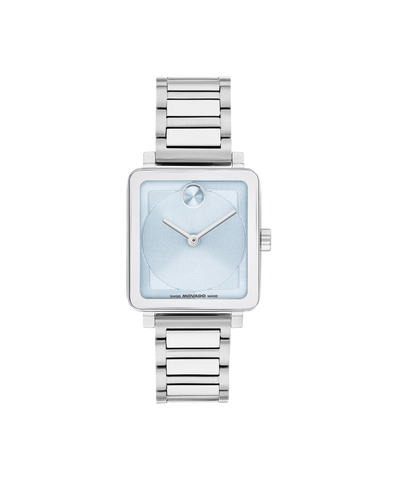 The Bold Evolution 2.0 is defined by an elevated, Bold case and a dimensional micro-textured dial. This 28mm x 26mm square watch features a light blue lacquer dial, slim steel hands, and our signature dot at 12 o'clock.