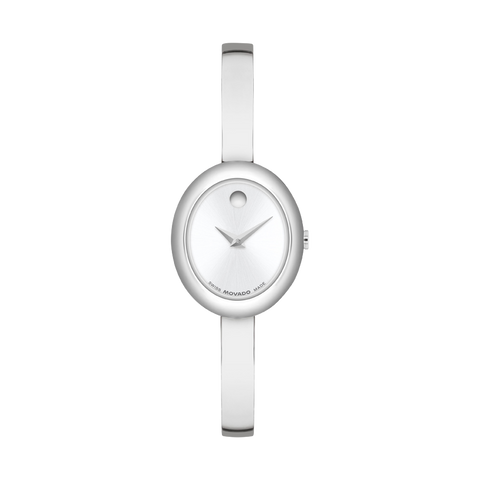 Modern, minimal, and made to stack. The Jewelry-Inspired Movado Museum Bangle. This 21.5mm by 25.5mm watch features an oval silver white sunray dial, steel dauphine hands, and our signature dot at 12 o'clock