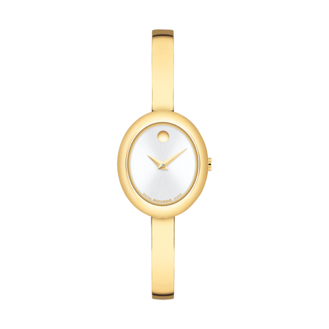 Modern, minimal, and made to stack. The Jewelry-Inspired Movado Museum Bangle. This 21.5mm by 25.5mm watch features an oval silver white sunray dial, yellow gold tone dauphine hands, and our signature dot at 12 o'clock