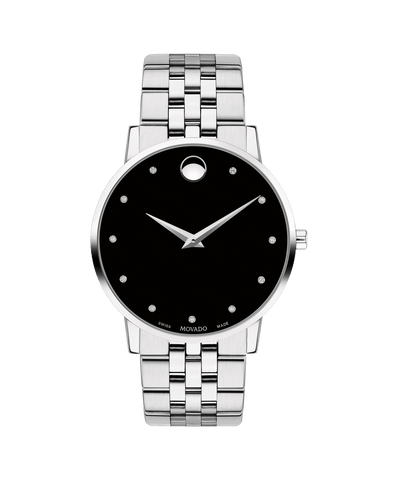 Men's Museum Classic watch, 40 mm stainless steel case, round black dial with 11 diamond markers (0.043 t.c.w.) and silver-toned dot and hands, stainless steel link bracelet with deployment clasp.