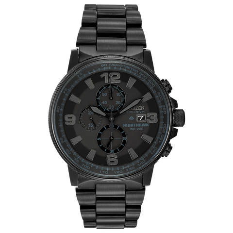 Master monochromatic style with the “Blackout” Nighthawk. The sporty design will strike up a conversation with its distinctive look in all black ion-plated stainless steel and with advanced features, including the 1/5 second chronograph that measures up to 60 minutes, 12/24 hour time and a tachymeter that measures speed based on time traveled over a distance. It also has screw-back...