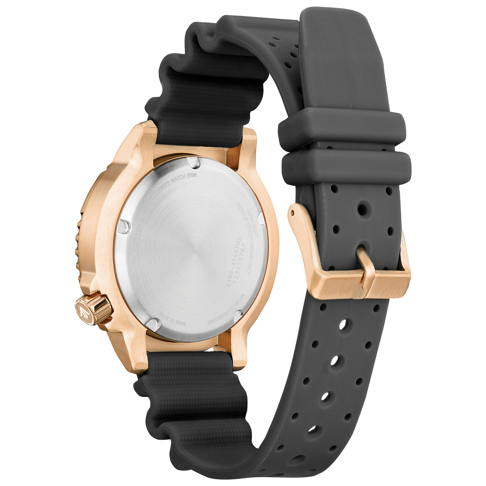 Explore the deepest depths with the latest Promaster Dive in a stylish new color. This must-have diving watch vibrantly features a rose gold-tone stainless steel case, a gray 3-hand dial with date function, and luminous hands and markers. The durable, gray polyurethane strap with buckle closure completes the look for a comfortable fit. Featuring our sustainable Eco-Drive technology powered by...