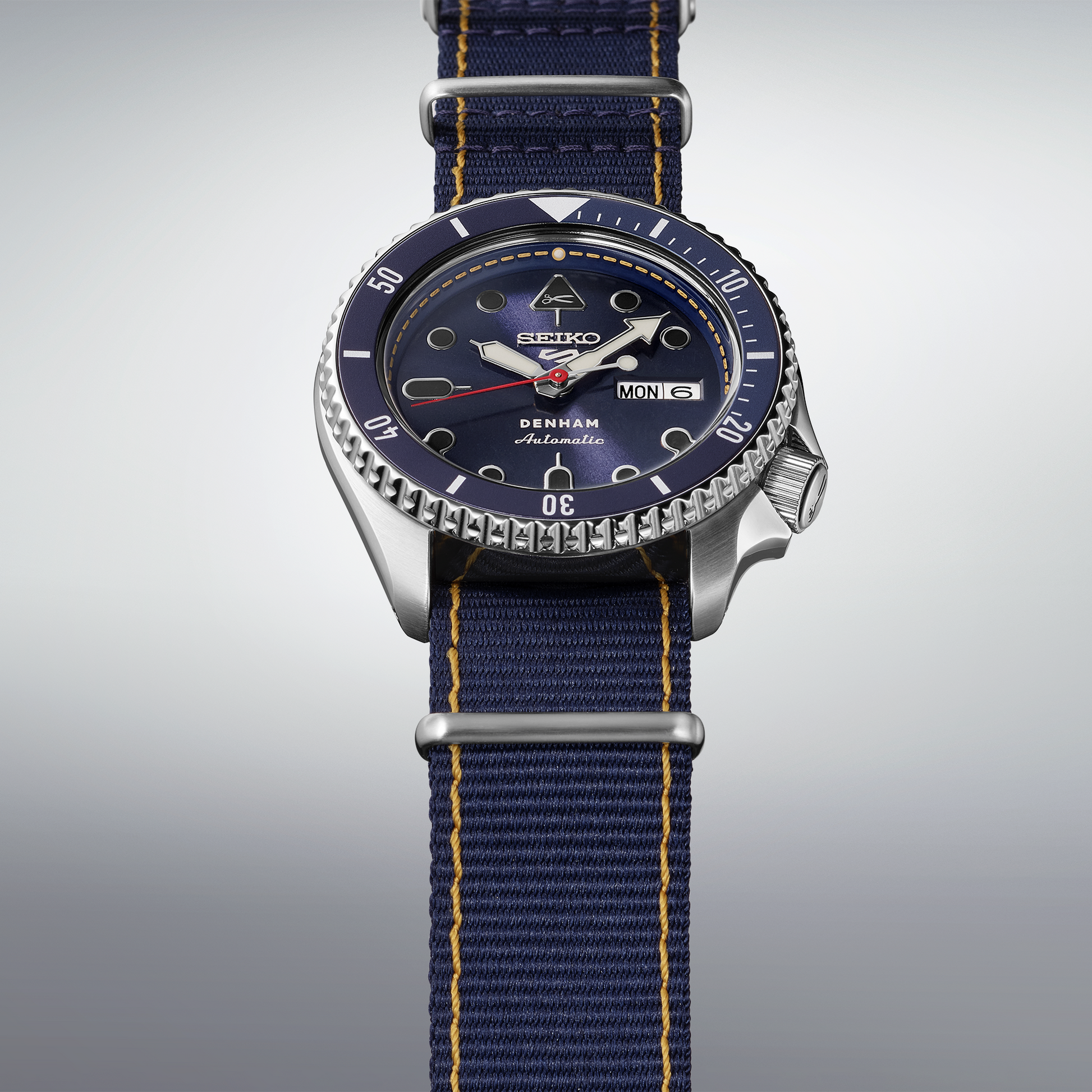 Seiko 5 Sports DENHAM Limited Edition. Designed in collaboration with DEHHAM, a denim brand born in Amsterdam, this unique Limited Edition is available only in a controlled production run of 2,000 with the production serial number engraved on the caseback. Framed by a bi-color blue uni-directional rotating bezel, the navy-blue sunray finish dial offers a day/date calendar, red second hand, and luminous hands and markers. The dial is accented by a dash pattern resembling the contrast stitching often used on denim, mirroring the stitching on the coordinating blue nylon strap, while the DENHAM logo, a pair of tailor scissors, is incorporated on the 12 o’clock marker, the crown, and the screwdown see-through caseback. An instant collectible, the timepiece is powered by a 24-jewel automatic movement that beats at a frequency of 21,600 vibrations per hour, with a power reserve of approximately 41 hours and manual winding capability. With a stainless steel case, this versatile watch is 100 meter water resistant- perfect for your style no matter what your day has in store and is presented in a Limited Edition collectors’ box.