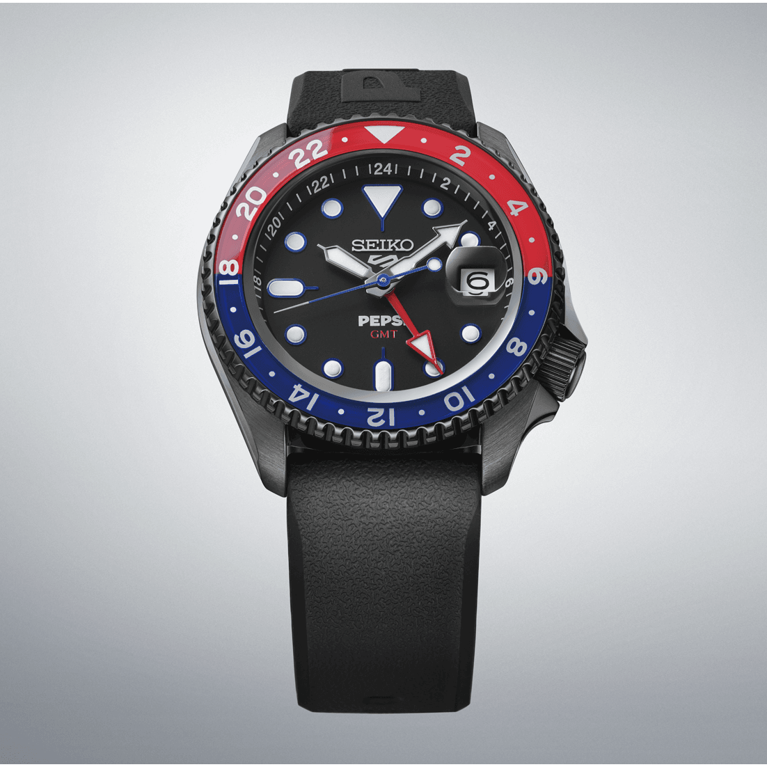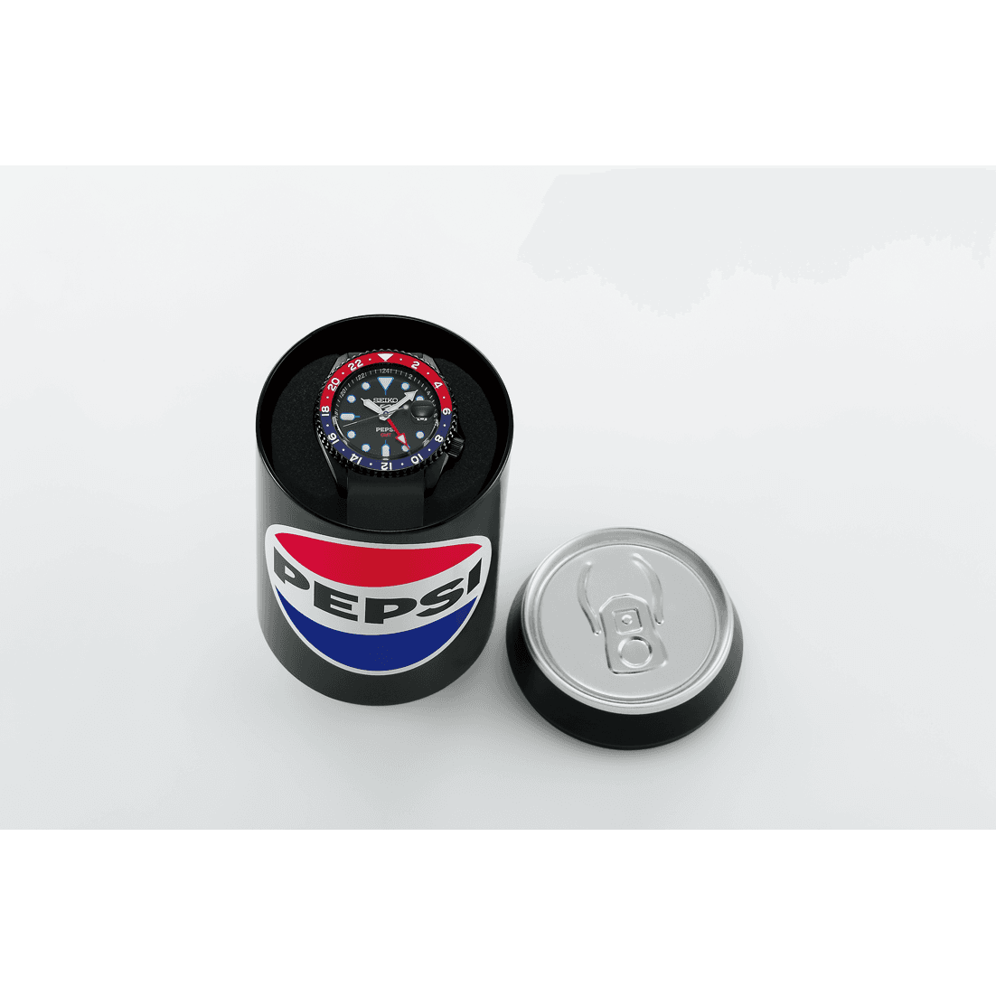 Seiko 5 Sports x Pepsi® Limited Edition. In collaboration with the globally popular beverage brand Pepsi, this exciting Limited Edition is based on the modern Pepsi logo, with a bold blue and sleek black color scheme courtesy of PepsiCo Design & Innovation. Adding new richness to classic sport/dress design, this dynamic watch offers a new variation on the popular SKX...