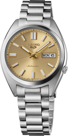 Show your style. Make your move. For over 50 years, Seiko 5 Sports has delivered consistently high levels of reliability, durability, and performance. Inspired by the best-selling SNXS series from the classic Seiko 5 collection of the past, this exceptional watch offers a compact case and bracelet design incorporating iconic elements of the original models with upgraded performance for today. Providing automatic technology that you control with every movement, this dynamic timepiece is powered by a 24-jewel movement that beats at a frequency of 21,600 vibrations per hour, with a power reserve of approximately 41 hours and manual winding capability. Framed by a metallic minute track, the golden sunray finish dial features diamond cut indices with gold finish and grooved top surfaces, a day/date calendar, and LumiBrite coating on the hands and markers for enhanced visibility in low-light conditions. Crafted of stainless steel with hairline and mirror finish, the sharply designed case has a low center of gravity for a comfortable fit and features a screwdown see-through caseback for a view of classic timekeeping in action, flowing seamlessly to a stainless steel bracelet with a tri-fold push button release clasp. 10 bar, 100M Water Resistant