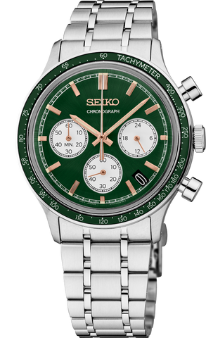 From the Essentials Collection. Inspired by motor sports, this dynamic timepiece features a rich green dial with rose gold accents and bold, high-contrast white subdials at 3, 6, and 9 o’clock styled to suggest a classic sports car. Framed by a streamlined green tachymeter bezel, the green dial offers a date calendar and LumiBrite hands and markers, while the chronograph...