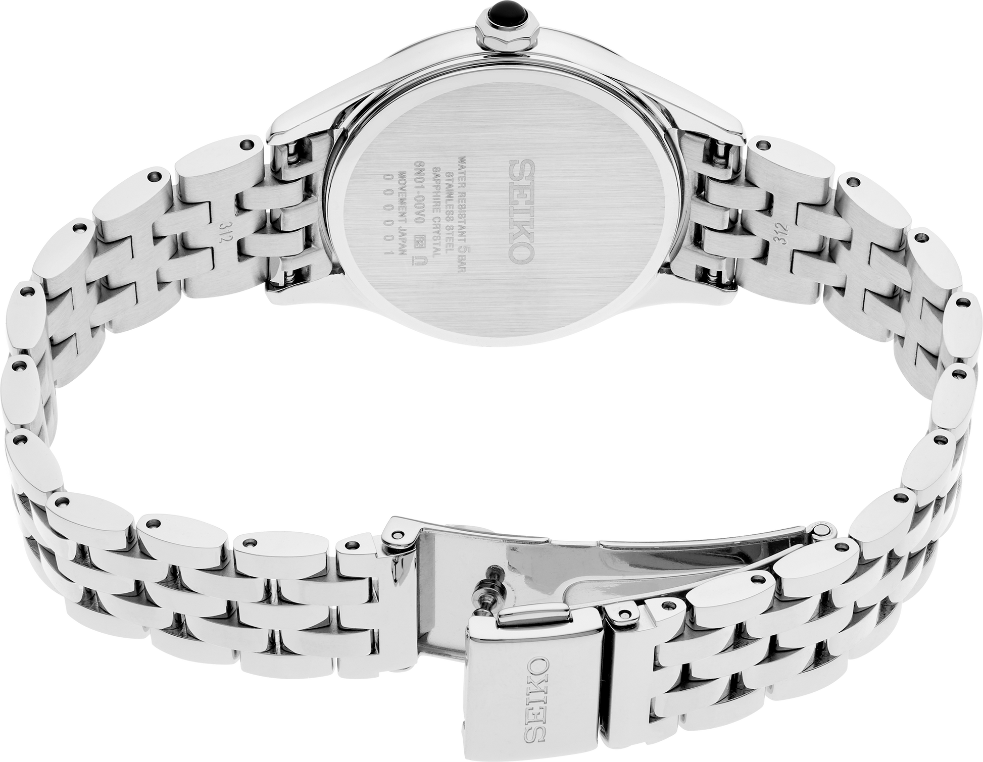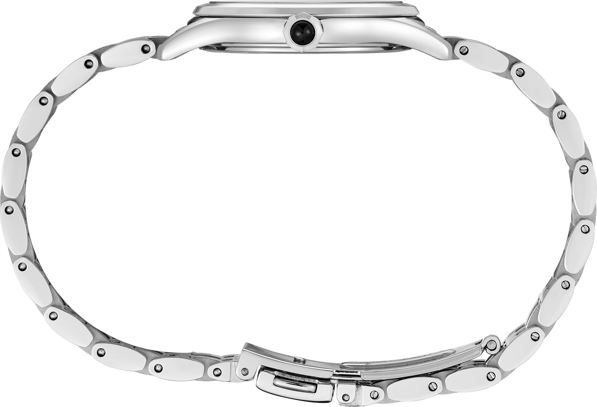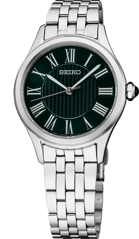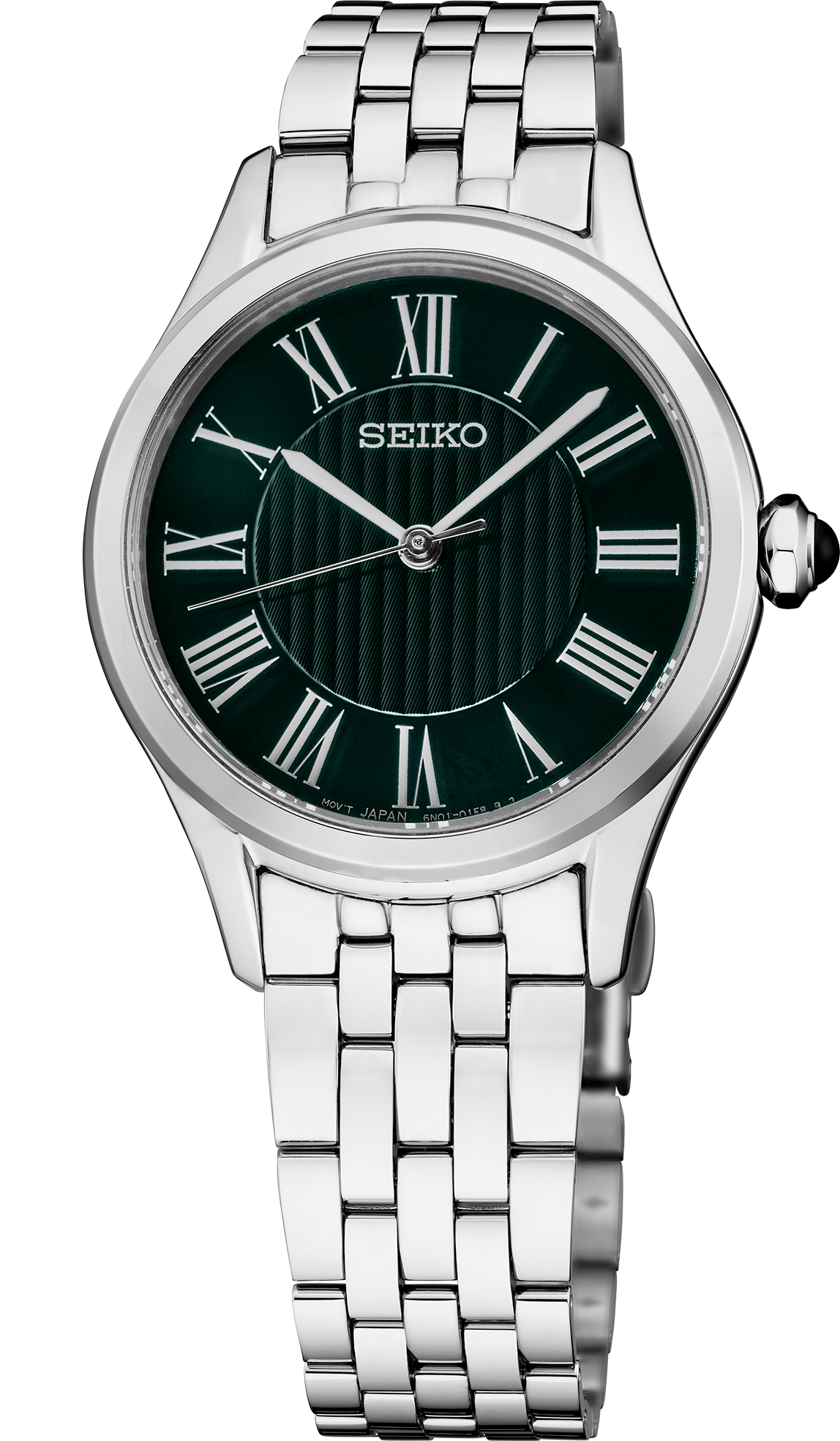 From the Essentials Collection. A sophisticated classic, perfectly proportioned for a jewelry-like feel, this elegant watch offers a patterned deep green Roman numeral dial, silver hands and a black cabochon crown. Crafted of stainless steel with a scratch-resistant sapphire crystal, the graceful design includes a five-row stainless steel bracelet for sleek wearing comfort, and a tri-fold push button release clasp. 5 bar, 50m Water Resistant