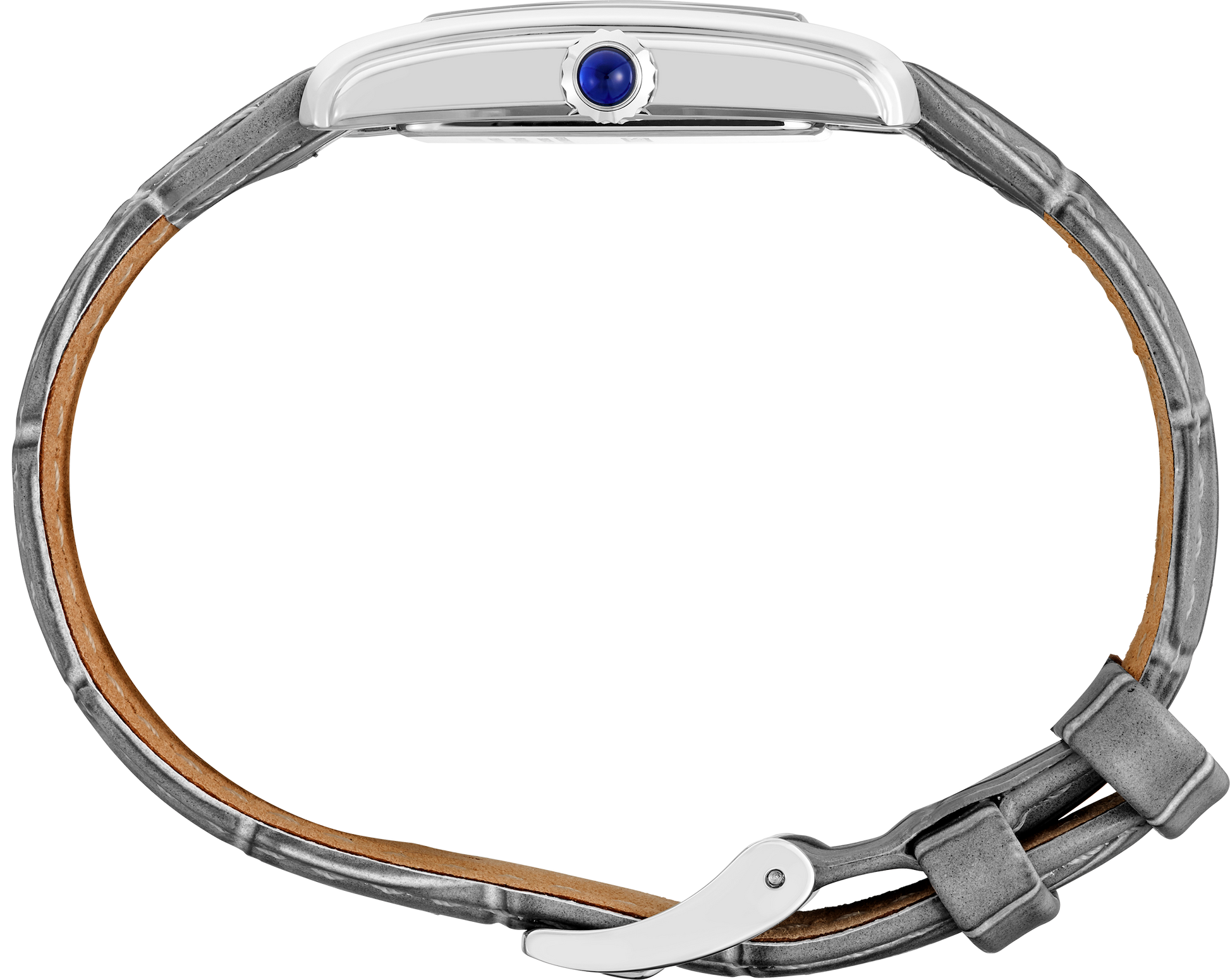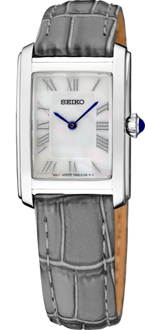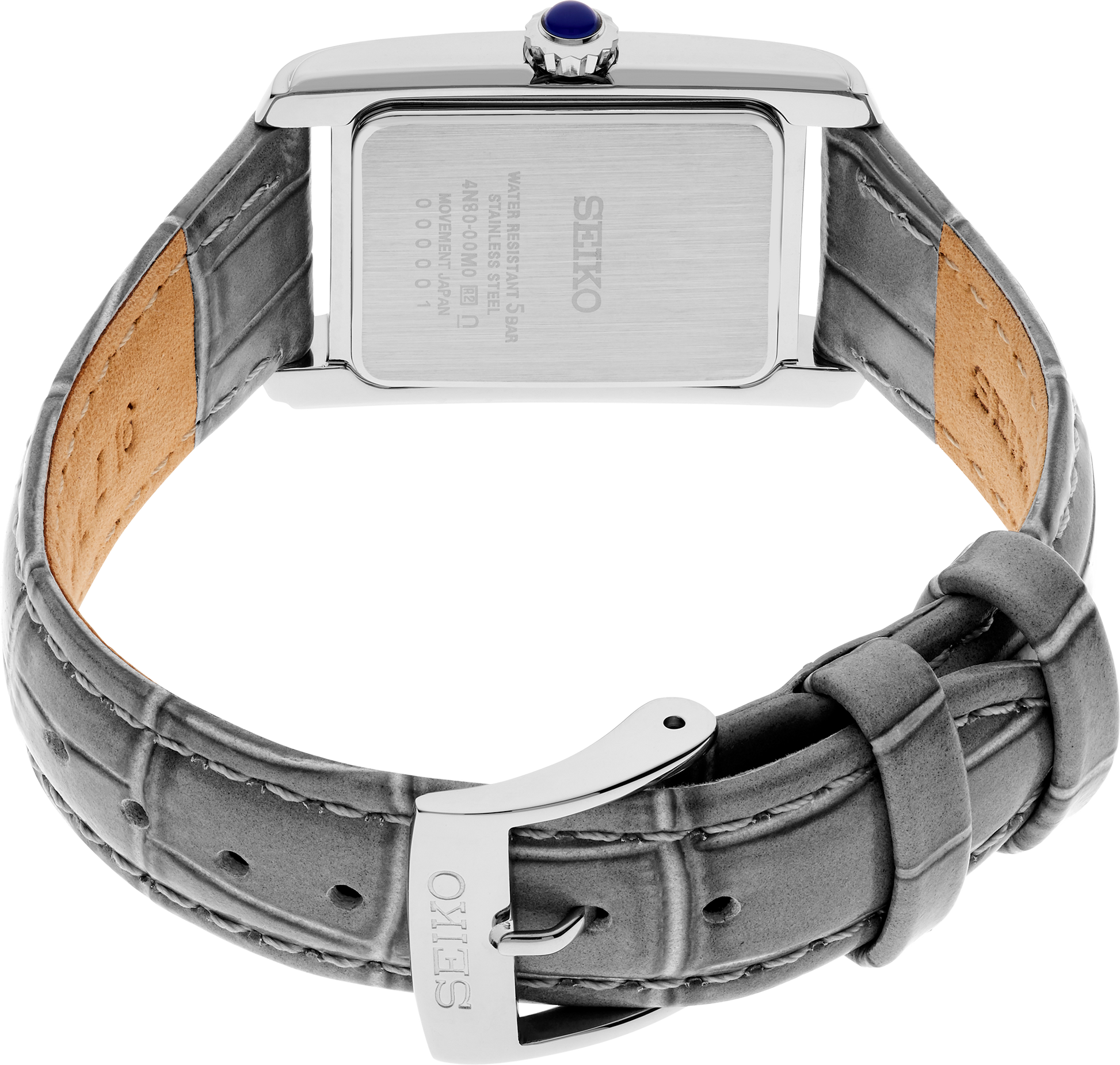 From the Essentials Collection. A contemporary classic, beautifully proportioned for a streamlined feel, this elegant watch offers a white mother-of-pearl Roman numeral dial, blue hands, and a blue cabochon crown. With a sleek rectangular case crafted of stainless steel, the graceful design includes a soft gray leather strap for superb comfort and sophisticated style. 5 bar, 50m Water Resistant