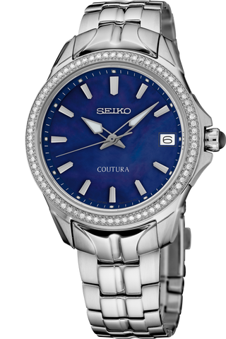 From the Coutura Collection. Expressing a polished and modern sophistication, the Coutura Collection combines bold angularity and elegant design with superior timekeeping for effortless sport/dress aesthetic. This versatile timepiece, perfect for day-to-night style, features a diamond bezel for a touch of luxury and a shimmering dark blue mother-of-pearl dial with silver applied indices, adding a rich 3-dimensional appearance to the...
