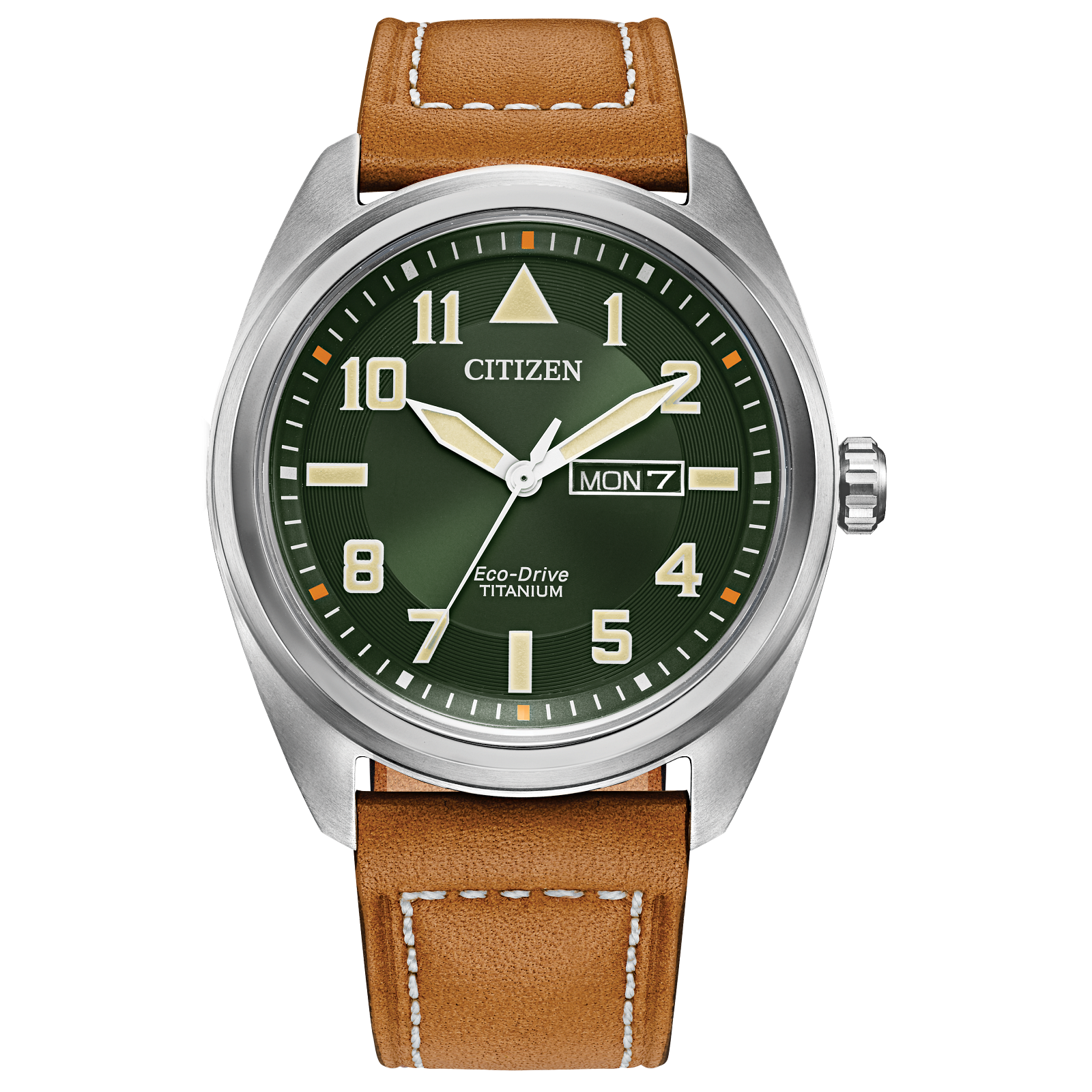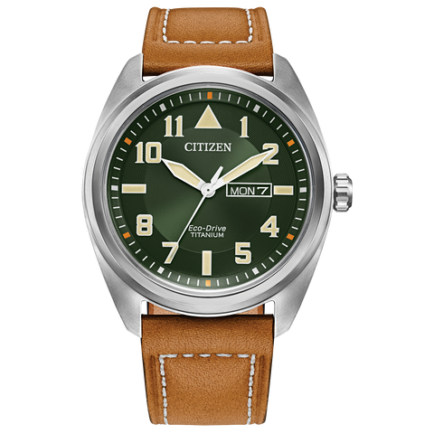 Rekindle the past with this vintage-inspired men’s watch by Citizen. Paying homage to the golden age of travel, this timepiece features a green dial with a rich caramel brown leather strap with contrast stitching. This retro-styled men’s watch features a Super Titanium stainless steel case and classic date function. This timepiece also features Citizen’s sustainable Eco-Drive technology, powering the watch...