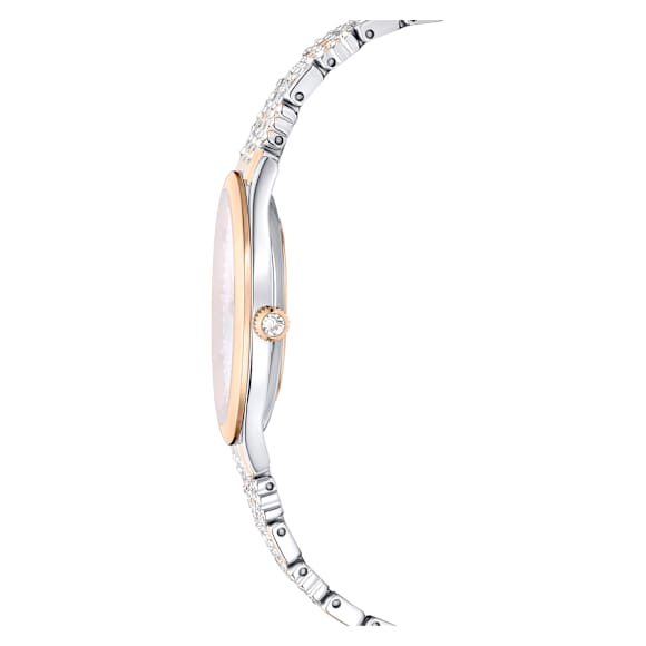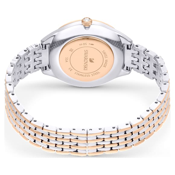 In this exquisite Swiss Made watch, the warm rose gold-tone finish is combined with cool stainless steel and a full array of 251 crystals. The colorway is a perfect match for the silver guilloche dial with crystals for index markers, and a slimline bracelet that is brought to life by a pavé of dazzling clear crystals. Notice the single stone...