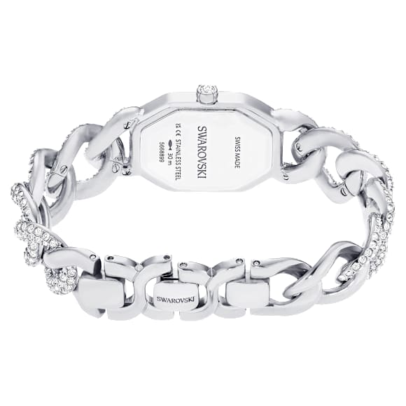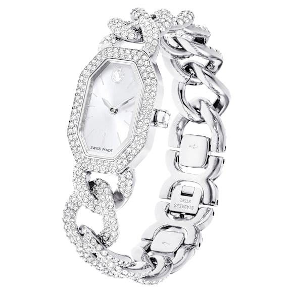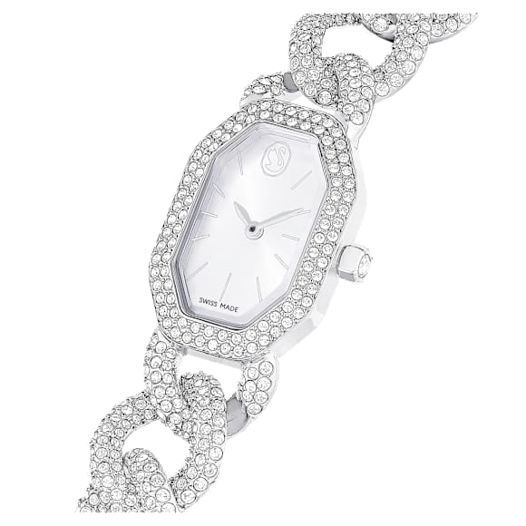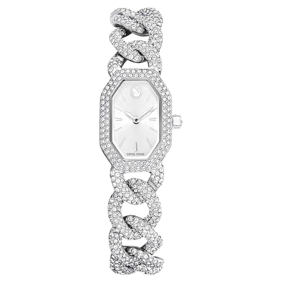 Highlighting Swarovski’s iconic octagon shape and set with 623 crystals, this dazzling watch wears like a piece of fine jewelry. The stainless steel case measures 44mm in length and features a shimmering pavé on the bezel alongside a sunray dial with an elegant swan logo at 12 o’clock. The watch is worn around the wrist on an adjustable gourmette chain...