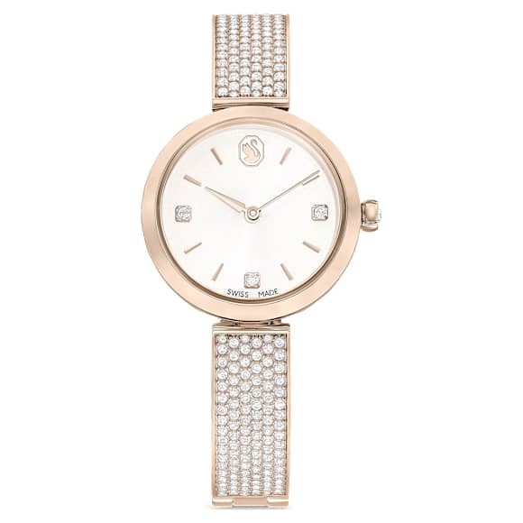 Illumina watches are crafted for sensational beauty around the wrist. This 27mm model features a champagne gold-tone finish and an adjustable bracelet that is neatly adorned with 210 clear crystals. Beneath the mineral glass, the sunray dial has a swan logo at 12 o’clock as well as three square crystals for index markers. Along with a single crystal placed in...