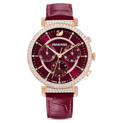 A perfect blend of modernity and tradition, this luxurious chronograph watch by Swarovski will elevate any outfit. Featuring a contemporary rose gold-tone PVD coated stainless steel case and burgundy sunray dial, the opulent and bold design sparkles with 100 clear crystals, set in rich pavé. The subtly integrated chronograph movement, trio of dial counters and Italian calf-skin leather strap in...