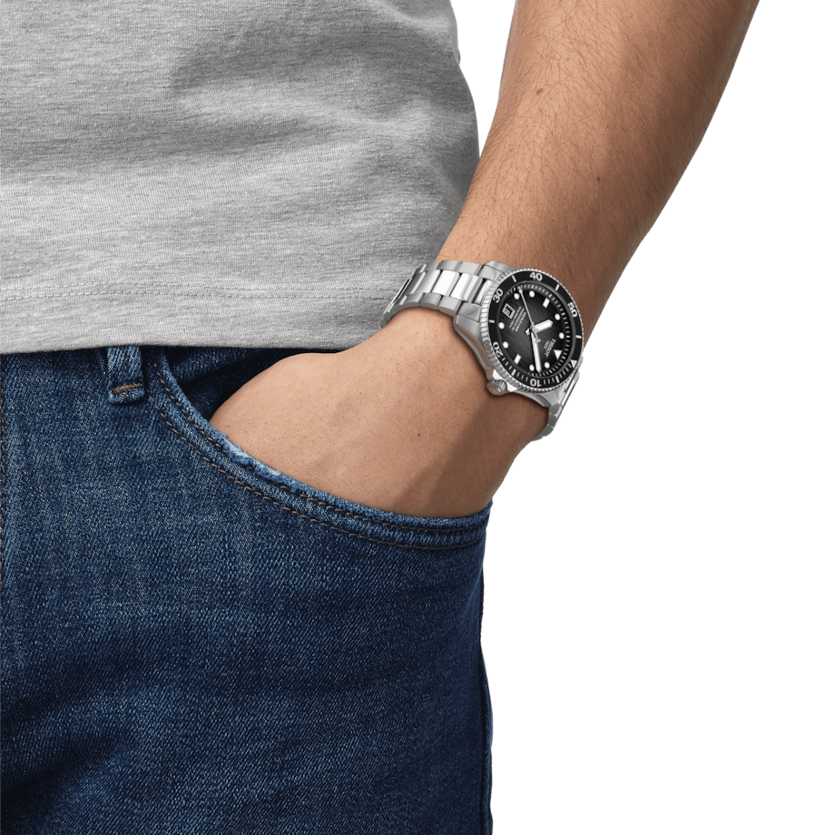 This updated edition of one of Tissot's main collections now introduces a 40mm casing option with the Powermatic 80 at its heart. For this new release, the casing has undergone a subtle transformation, incorporating a notch along its case edges, resulting in a more compact and sophisticated appearance. These timepieces are perfect for those in search of a sporty yet assertive accessory, offering water resistance up to 1000 feet (300 meters) and improved visibility in dim conditions thanks to the Super-LumiNova® coated hands and hour markers. This release features five distinct models, varying in dial colors and finishes from stainless steel to bi-color combinations, including unique blue to black gradients and exclusive black PVD-coated options. Each variant delivers a unique aesthetic while maintaining the collection's signature sporty yet bold appeal.