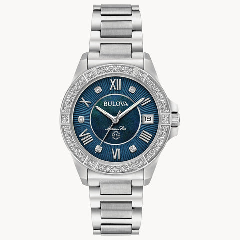This new addition to the Bulova ladies’ Crystal collection balances a dressy aesthetic with sporty versatility. The silver-tone stainless steel case has a sweeping polished bezel fully set with dazzling crystals that complement the dial and bracelet, a total of 128 crystals providing sparkling beauty on the wrist. The opalescent mother-of-pearl dial features silver-tone hands with luminescent fill, polished silver-tone...