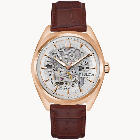 This new men’s automatic timepiece from the Bulova Surveyor collection offers modern elegance and luxurious craftmanship at an exceptional price. The contemporary rose gold-tone stainless steel case delivers an eye-catching blend of brushed and polished surfaces with a subtle angularity and a... domed mineral crystal. The remarkable dial is highlighted by the stunning display of the skeletonized automatic 21-jewel movement,...