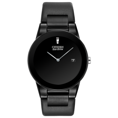 Axiom's refined yet sleek design offers a day-to-night fashion options for the avid trendsetter. In stainless steel with black ion plating, black leather band, black dial and stainless steel accents and the intriguing feature of edge-to-edge glass. Featuring our Eco-Drive technology – powered by light, any light. Never needs a battery. Caliber number J165.