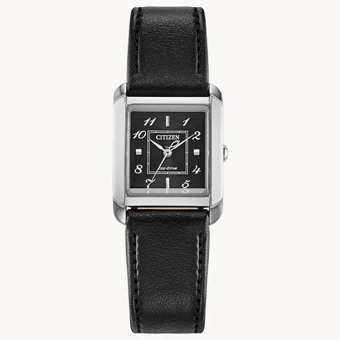 Classic lines and subtle sophistication make this latest piece to our womens’ collection, the Citizen L Bianca, a... charming addition of sustainable luxury. With a design inspired and celebrating feminine motifs in art deco, the distinctive stainless-steel timepiece is a captivating accent on the wrist that's perfect for everyday wear. A curved rectangular shape defines the watch’s 22mm silhouette, with a subtle crown and black leather strap rounding out the look. On its deep black dial, alternating applied and printed markers work with a pair of silver-tone hands for a highly aesthetic style, with its printed inner square once again pointing to glamorous inspirations. Sustainably powered by any light with our proprietary Eco-Drive technology that never needs a battery, this elegant ladies’ watch is the perfect addition to any outfit. Water resistant to 50 meters. Caliber B035.