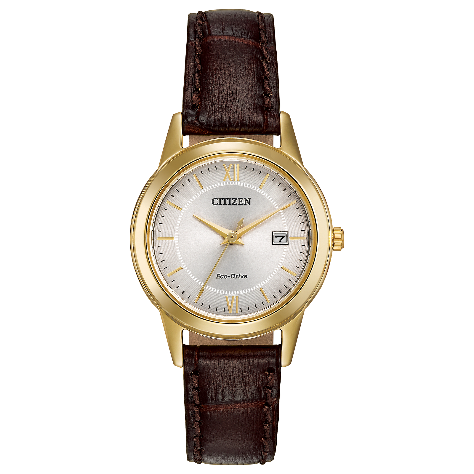 Keep it simple with the classic lines and rich leather strap of these ladies CITIZEN® strap watches. Featured with gold-tone stainless steel case, brown leather strap, ivory dial with gold-tone accents and date.Featuring our Eco-Drive technology – powered by light, any light. Never needs a battery. Caliber number J710.