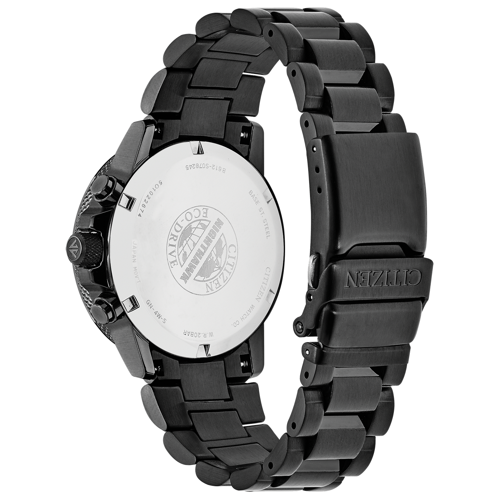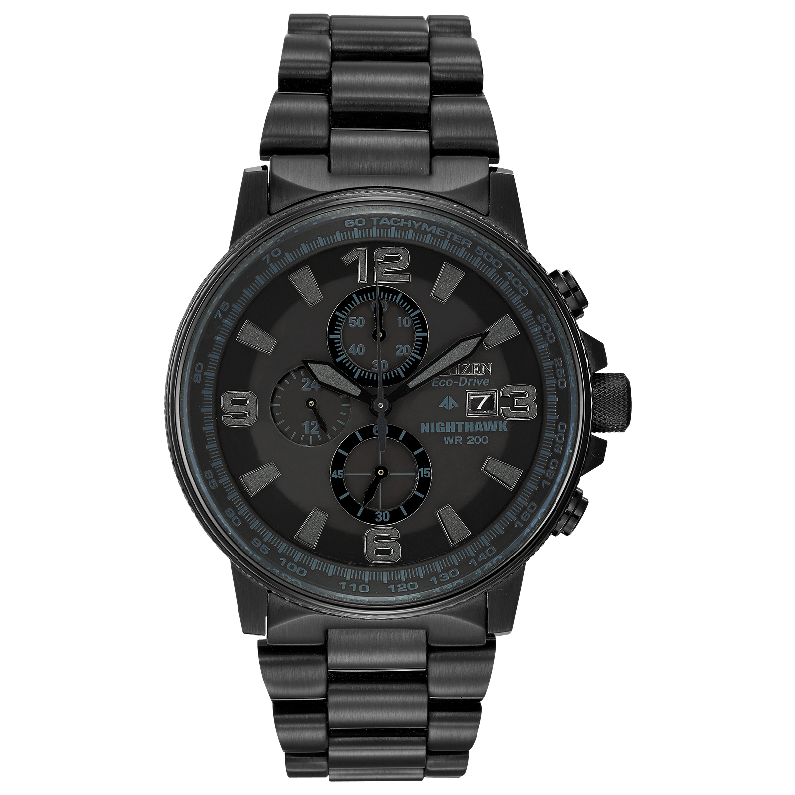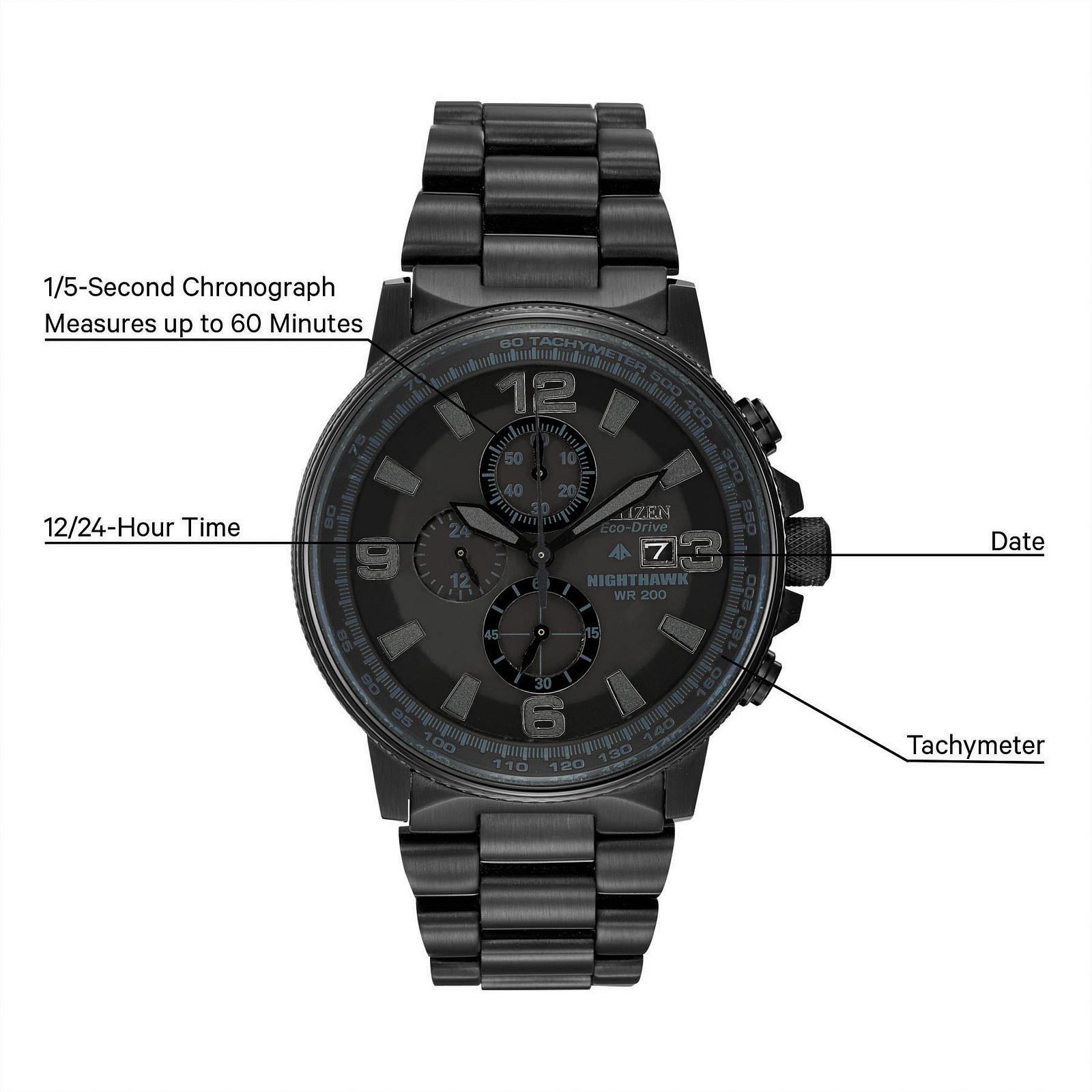 Master monochromatic style with the “Blackout” Nighthawk. The sporty design will strike up a conversation with its distinctive look in all black ion-plated stainless steel and with advanced features, including the 1/5 second chronograph that measures up to 60 minutes, 12/24 hour time and a tachymeter that measures speed based on time traveled over a distance. It also has screw-back case, a bracelet with safety foldover clasp with push button, and water resistant to 200 meters. Featuring our proprietary Eco-Drive technology that’s sustainably powered by any light and never needs a battery, this versatile watch stands out is essential for every man’s weekday to weekend wardrobe. Caliber number B612.