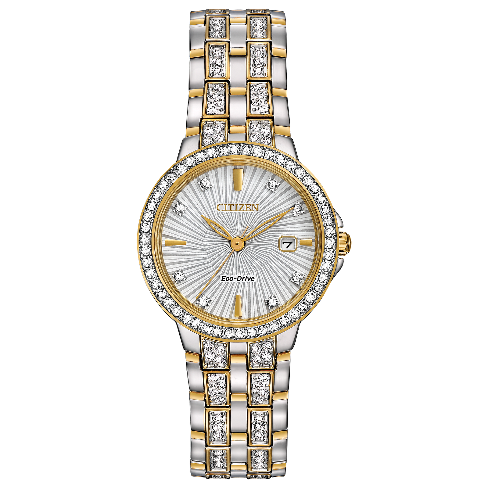 Classic lines and fashionable edge with lots of sparkle are hallmarks of this Citizen Silhouette Crystal two-tone stainless steel bracelet. Featuring a two-tone accented dial, bright crystals and date feature. Featuring our Eco-Drive technology – powered by light, any light. Never needs a battery. Caliber number E013.