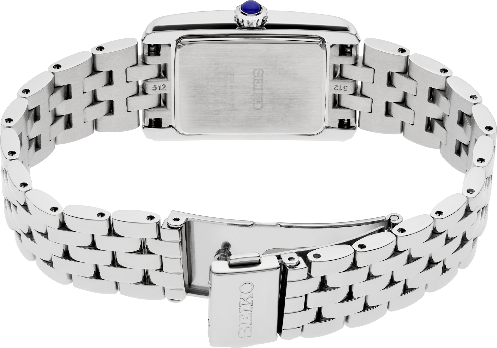 From the Essentials Collection. A sophisticated classic, perfectly proportioned for a jewelry-like feel, this elegant timepiece features a rectangular case adorned by 34 crystals, a patterned white Roman numeral dial with blue hands, and a blue cabochon crown. Crafted of stainless steel, this graceful design includes a five-row stainless steel bracelet for sleek wearing comfort, and a tri-fold push button...