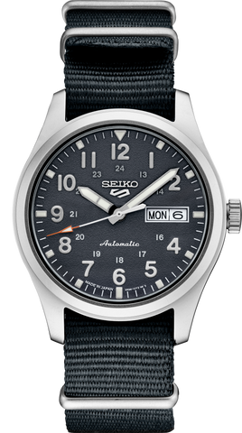 Seiko 5 Sports. Inspired by classic field/military design, this stylishly retro watch offers authentic lines with both durability and all-day excellence. Providing automatic technology that you control with every movement, this versatile watch is powered by a 24-jewel movement that beats at a frequency of 21,600 vibrations per hour, with a power reserve of approximately 41 hours and manual winding...