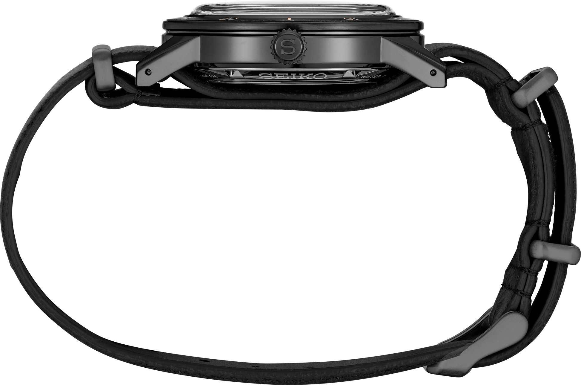 Presage Style ’60s Collection. Offering the finest in Japanese mechanical watchmaking, the Presage Collection blends precision technology with superior craftsmanship and design. With broad angular lines and such vintage details as box-shaped crystals, faceted indices and sharp hand design, plus the use of neutrals and earth tones, the Style ’60s collection creates a warm, retro feel. Celebrating the fresh spirit of the 1960s, the collection takes particular inspiration from Seiko’s 1964 “Crown Chronograph,” Japan’s first watch with a stopwatch function. Framed by a black bezel, the black dial of this dramatic timepiece features a date calendar, as well as beige LumiBrite hands and markers. The screwdown see-through caseback provides a view of the 23-jewel movement with manual winding capability, a frequency of 21,600 vibrations per hour and a power reserve of approximately 41 hours. Crafted of stainless steel with black hard coating, this exceptional watch includes a black deerskin strap, and a box-shaped crystal. 5 bar, 50M Water Resistant