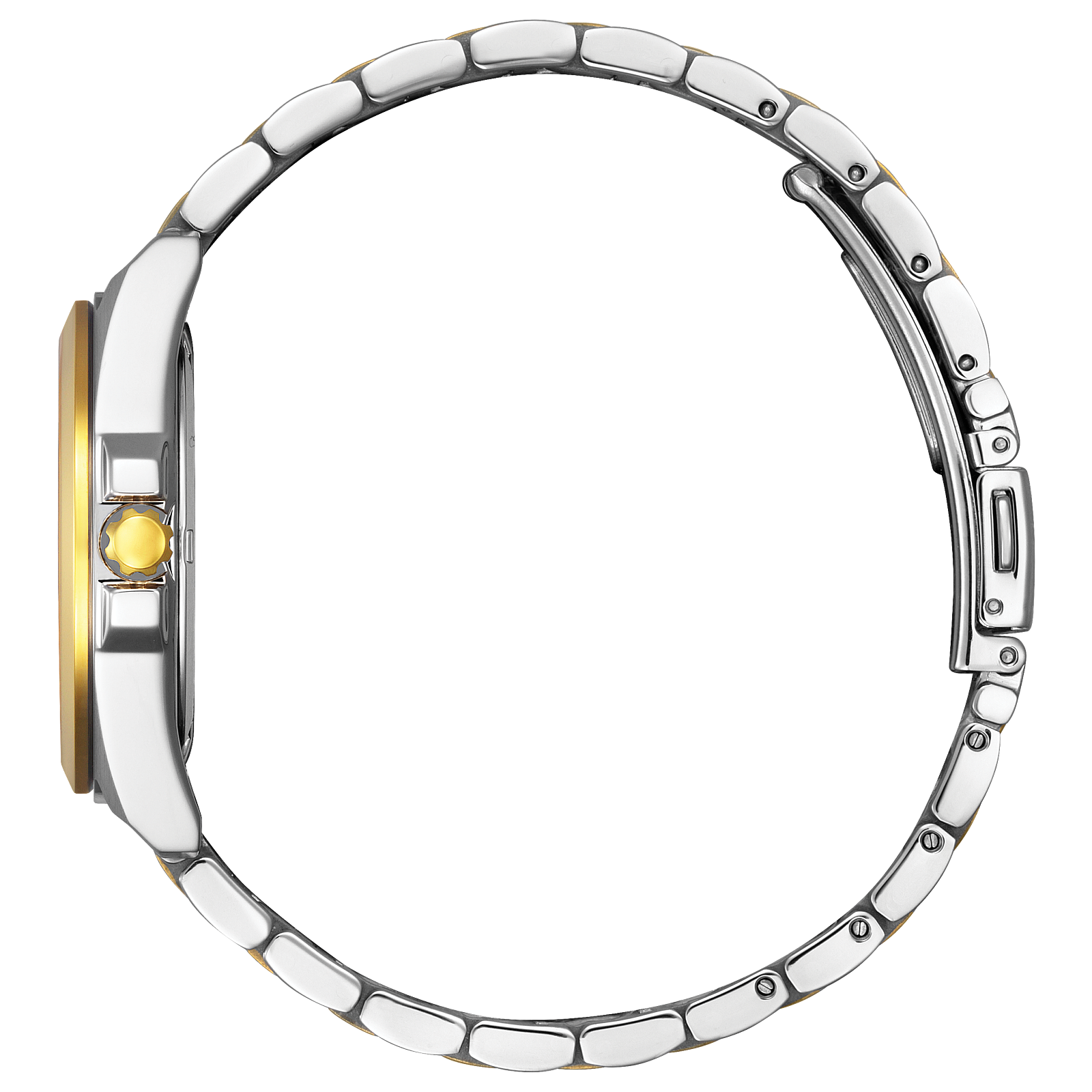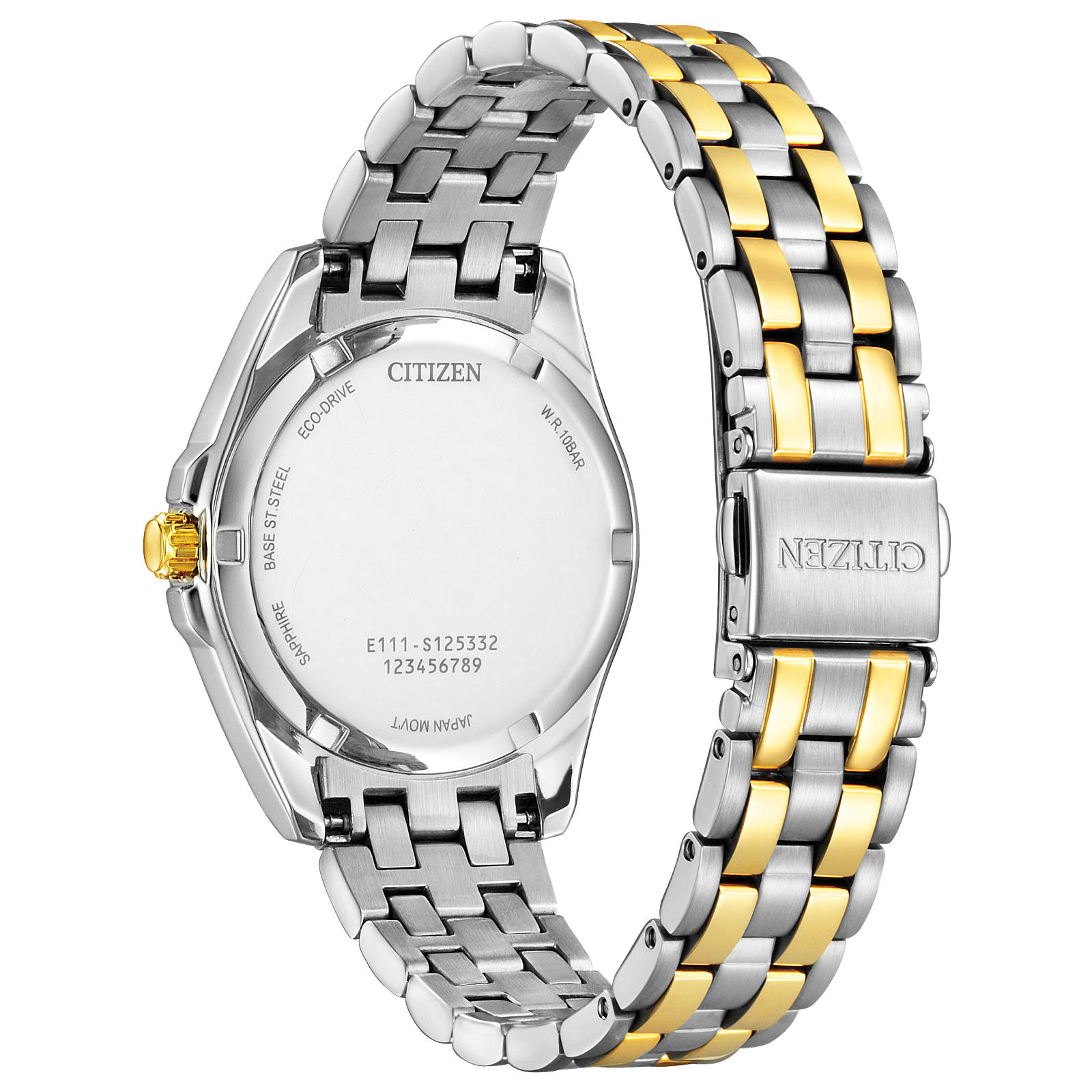 This classic timepiece from Citizen is a popular women’s watch that will never go out of style. It features a two-tone stainless steel bracelet-style watch band, paired with a mother-of-pearl three-hand dial to make a watch that will look great for any occasion. In addition to showing the current date, the watch is sustainably powered by light with the exclusive...