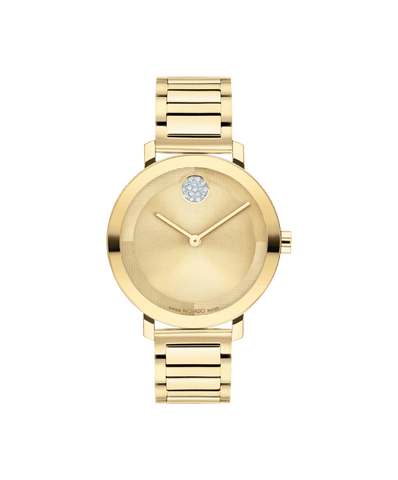 The evolution of modern design with a sharp look and elevated feel. Crafted from pale yellow goldtone ion-plated stainless steel, this sleek timepiece features a statement-making 34mm case that houses a captivating micro-textured goldtone dial with a glossy lacquer overlay, slim hands, and our iconic dot motif at 12 o’clock in sparkling crystals.