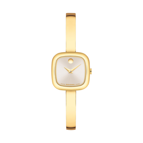 Modern, minimal, and made to stack. The Jewelry-Inspired Movado Museum Bangle. This 21.5mm watch features a cushion champagne sunray dial, yellow gold tone dauphine hands, and our signature dot at 12 o'clock.