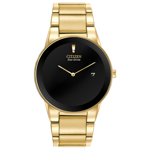 Axiom's refined yet sleek design offers a day-to-night fashion options for the avid trendsetter. Available in men's and ladies', featuring a gold-tone stainless steel case and bracelet with a black dial and the intriguing feature of edge-to-edge glass and date. Featuring our Eco-Drive technology – powered by light, any light. Never needs a battery. Caliber number J165.