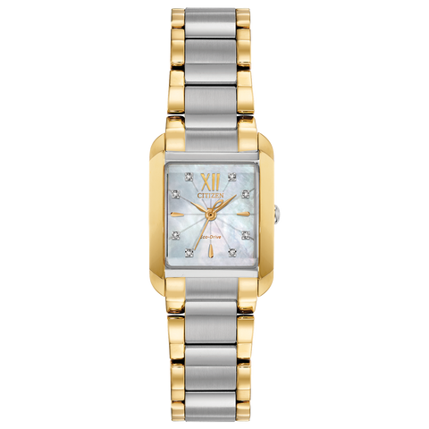 The CITIZEN L Collection represents the epitome of a ladies timepiece, showcasing all the sophistication, style and power that appeal to today's woman. The simplicity of the Citizen L case is partnered with an elegant light white Mother-of-Pearl dial with beveled sapphire crystal. Featured here in two-tone stainless steel. Featuring our Eco-Drive technology – powered by light, any light. Never...
