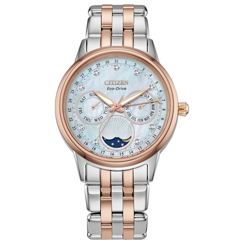 For a touch of modern elegance paired with advanced complications, Citizen’s Calendrier women’s watch fits the bill. It has a pink-gold-tone stainless steel bracelet and pink-gold-tone 37mm case, with a white mother of pearl three-hand dial set with diamonds. It uses Eco-Drive technology, so it is powered by light — any light — and in addition to showing the month,...