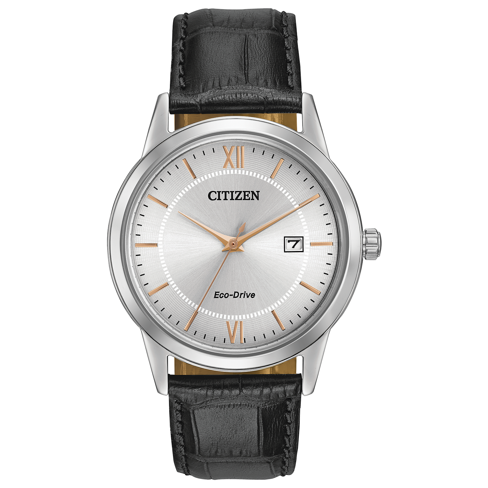 Keep it simple with the classic lines and rich leather strap of these men's CITIZEN® strap watches. Featured with stainless steel case, black leather strap, metallic silver dial with rose gold accents and date. Featuring our Eco-Drive technology – powered by light, any light. Never needs a battery. Caliber number J810.