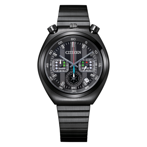 You’re in command with the Darth Vader-inspired timepiece, part of the Star Wars™ | Citizen Tsuno Collection. The detailed design evokes the powerful authority of Darth Vader’s presence – the colors of the chronograph hands echo his transformation from Jedi™ to Sith™, and the sub-dials feature green and red design elements inspired by his iconic armor. A black ion-plated stainless steel case and bracelet perfectly complement the black brass dial that features the date near 5 o’clock. The case back is etched with the Darth Vader character and classic Star Wars logo. This exciting collection features 4 timepieces in all, each with a vintage design inspired by Citizen’s famed 1972 model known as the Tsuno Chrono, thanks to tsuno “horns” placed on both sides of the 12 o’clock position. This watch requires a battery. Caliber number 0510.
