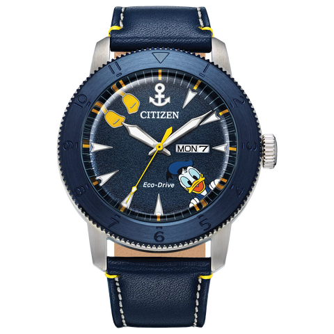Don a Disney Donald Duck timepiece from CITIZEN, inspired by the original best friend. Feisty and flustered at times, Donald Duck peeks through the 4 and 5 o’clock markers against a blue gradient dial with yellow accents. Inspired by his sailor attire, a nautical theme prevails in navy blue with an anchor on the dial at 12 o'clock. A stainless...