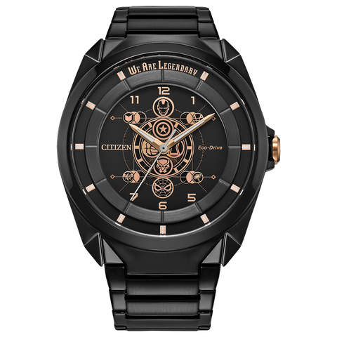 Celebrating superior artistry, unforgettable characters, and matchless storytelling, the new Marvel | Citizen 85th Anniversary limited edition boxed set has landed to save the day. Spider-Man, Iron Man, Hawkeye, Captain America, Captain Marvel, Thor, Black Widow, Hulk, Black Panther, and Dr. Strange are represented by distinctive gold-tone icons on the black dial with lume-filled gold-tone hands, markers, and numbers, plus...