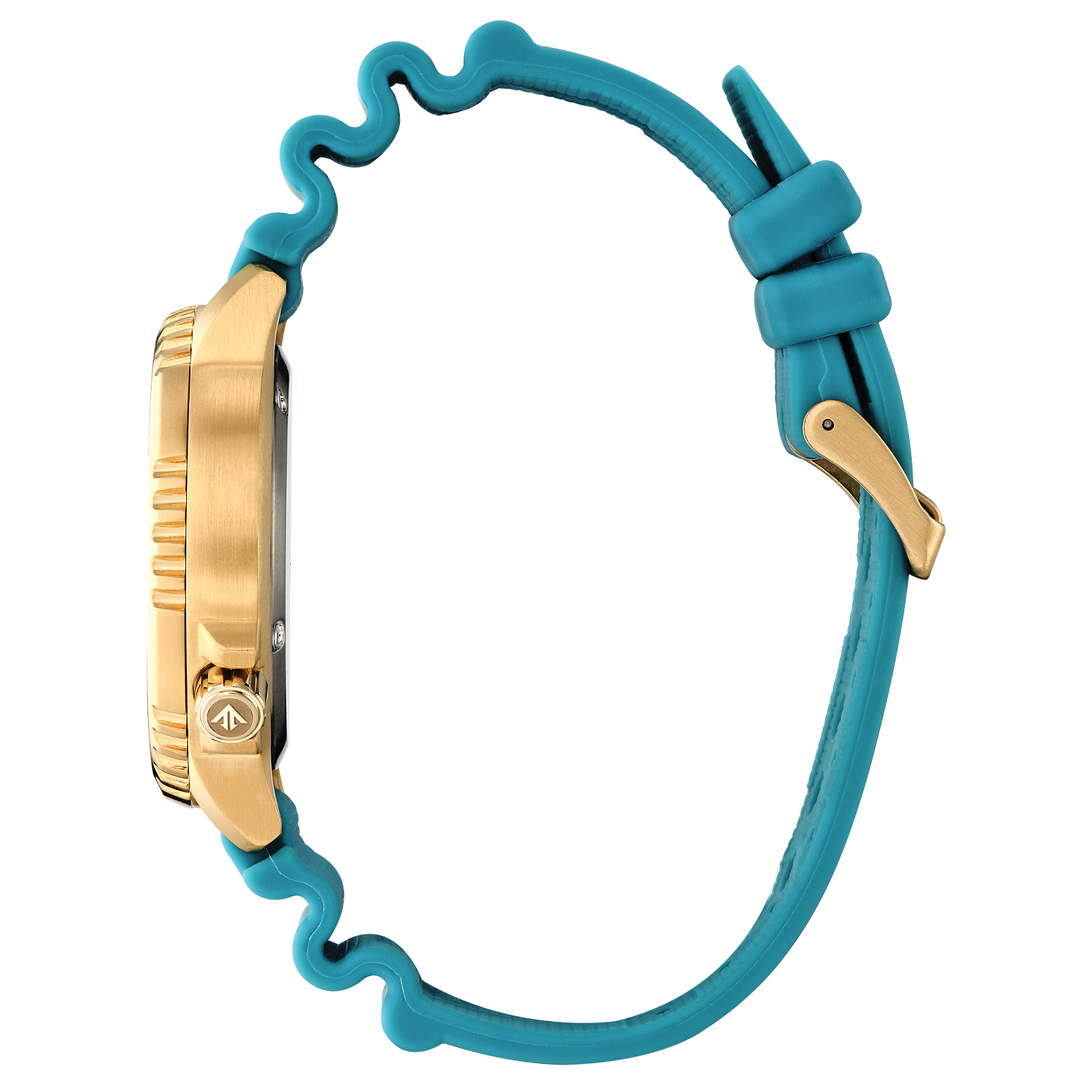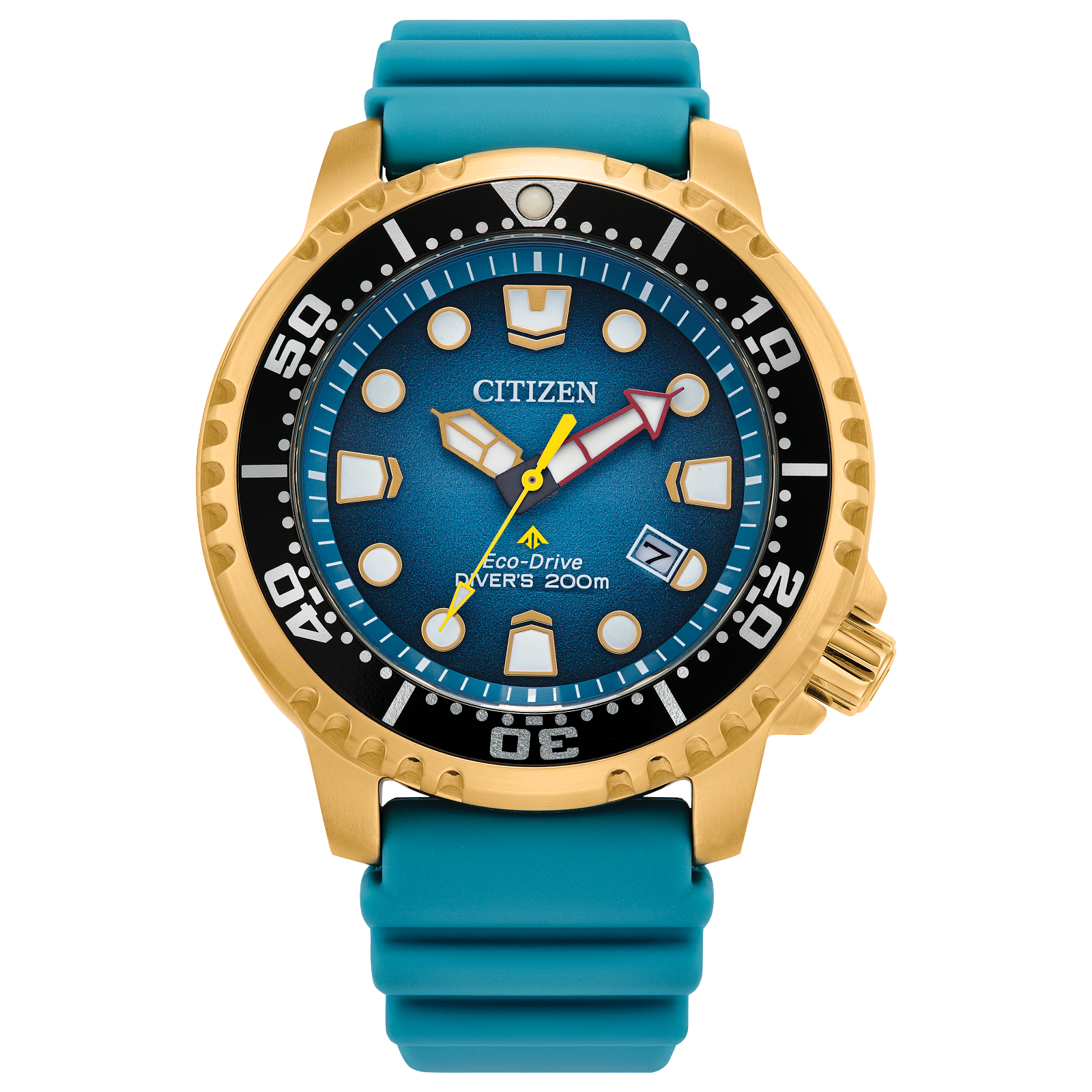 Explore the deepest depths with the latest Promaster Dive in a stylish new color. This must-have diving watch vibrantly features a gold-tone stainless steel case, a turquoise 3-hand dial with date function, and luminous hands and markers. The durable, matching turquoise polyurethane strap with buckle closure completes the look for a comfortable fit. Featuring our sustainable Eco-Drive technology powered by...