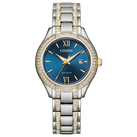 With 114 genuine crystals on the case and bracelet, the Ladies Silhouette Crystal from Citizen will shine no matter where it goes. The two-tone stainless steel case and band are accented with a bold navy blue three-hand dial for a unique watch that is a must-have for any collection. And you’ll never have to worry about replacing the battery —...