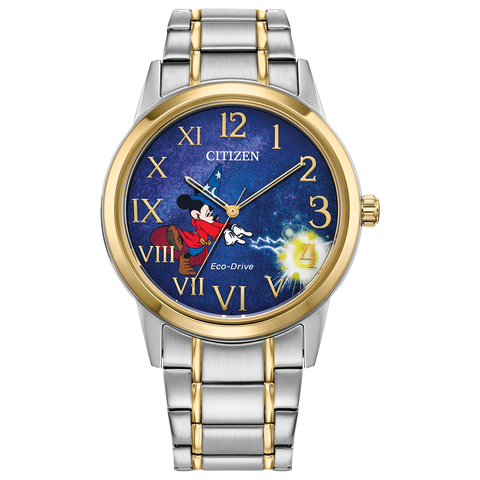 One of the most exciting adventures of the 1940s soon became the making of the Walt Disney Animation film, Fantasia, and the breakthroughs in color, sound, and motion. A magical Sorcerer Mickey waves his wand, and POOF, the Arabic markers turn to Roman on the dark of night dial. This Disney x Citizen watch features an incredibly detailed dial within...