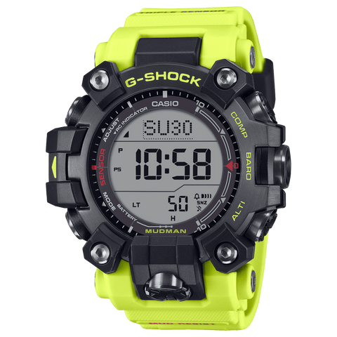 Whatever you’re doing, wherever you are — the G-SHOCK Master of G line has your back.For total support in the harshest environments, this MUDMAN watch delivers peak performance in punishing conditions on land. It features bold black to exude toughness and a band in the same bright yellow used for emergency rescues and safety signs. This innovative design is a...