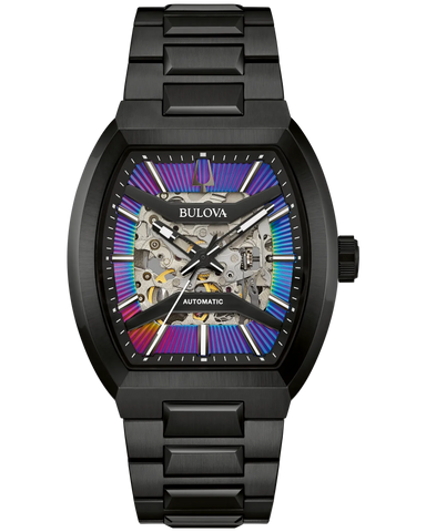 This Bulova men’s watch from the Maquina collection offers daringly avant-garde design. The watch features a 40mm black-tone stainless steel case with a curved sapphire crystal, a black bezel, and a black-tone stainless steel bracelet with a push-button deployant closure. The rainbow-colored patterned dial has black hands and silver-tone markers with luminescent fill and a central aperture revealing the...